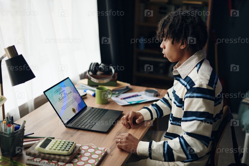 Счастливый чернокожий мальчик получает сертификат о достижениях на ноутбуке дома