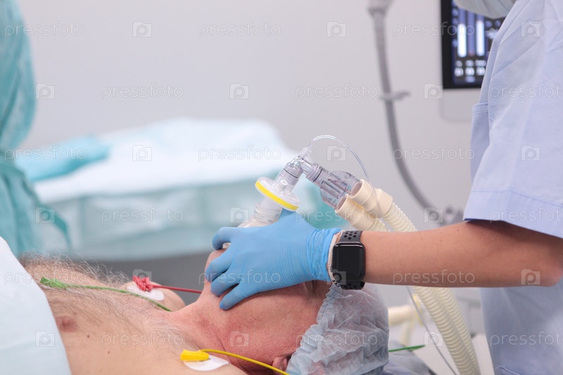 Анестезиолог держит дыхательную маску на лице пациента. Пожилой мужчина под наркозом. На лице пациента находится дыхательная маска. Подготовка к операции. Фото в операционной. Современная медицина