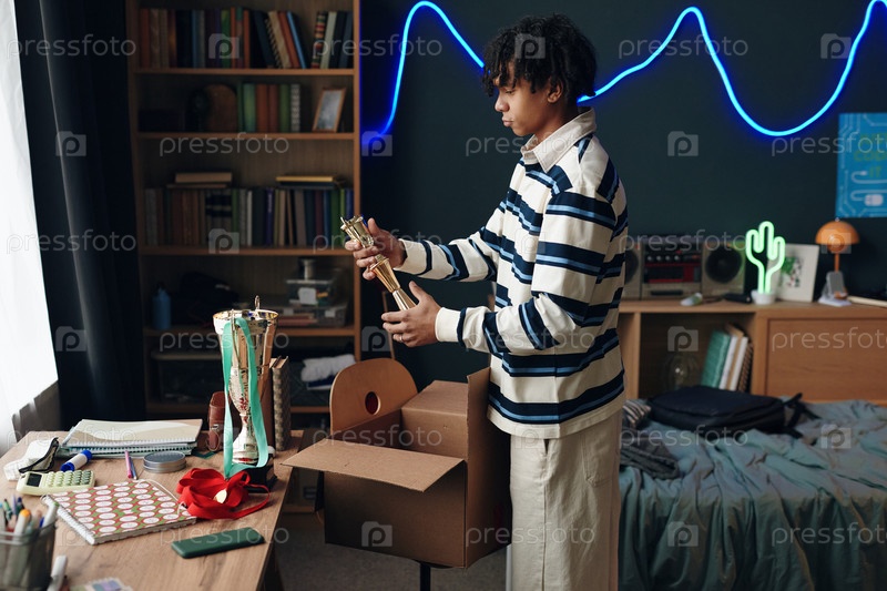 Черный мальчик-подросток упаковывает трофеи в коробку в спальне