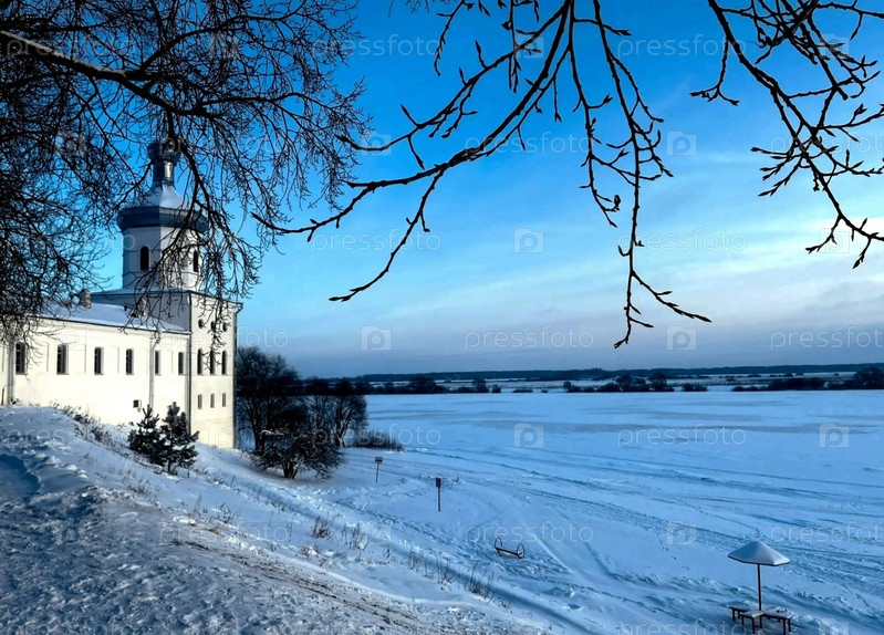 Юрьевский монастырь, Михайловская башня. Вид на замерзшую реку Волхов. Великий Новгород. Россия. Январь 2026