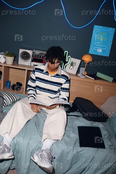 Молодой взрослый чернокожий мужчина сидит на кровати Читать учебные материалы в спальне