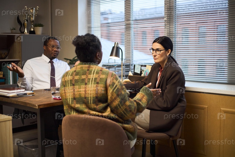 Чернокожая женщина средних лет обсуждает школьные вопросы с директором и коллегой