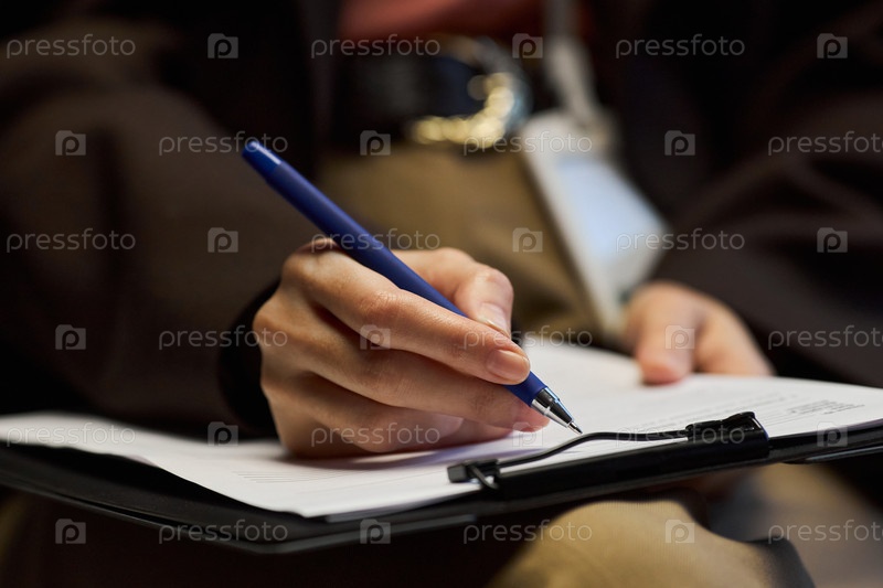 Женщина среднего возраста пишет заметки во время встречи директора школы