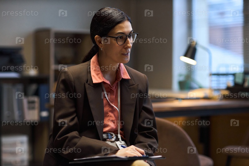 Женщина среднего возраста Директор школы слушает во время офисной встречи