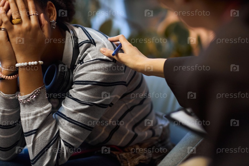 Женщина среднего возраста утешает огорченного чернокожего подростка в школе