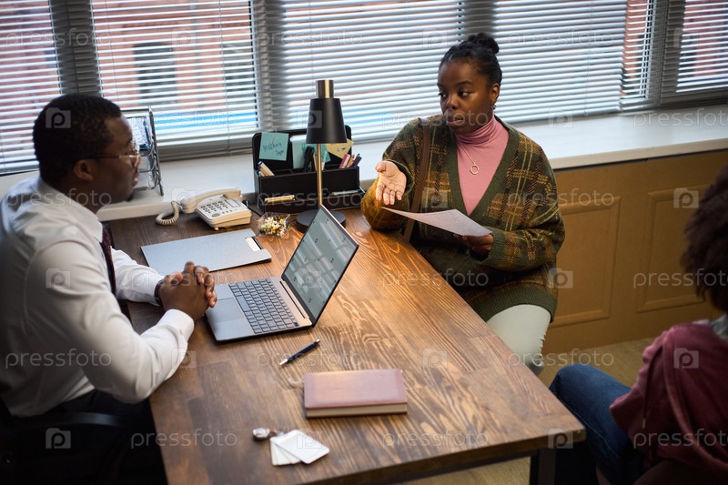 Чернокожий мужчина средних лет слушает молодую черную женщину, объясняющую ситуацию