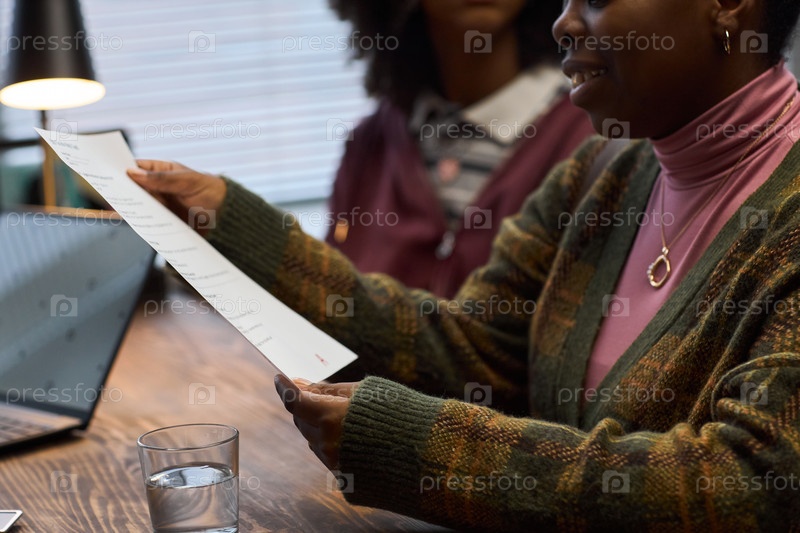 Чернокожая женщина среднего возраста просматривает документ во время встречи директора школы