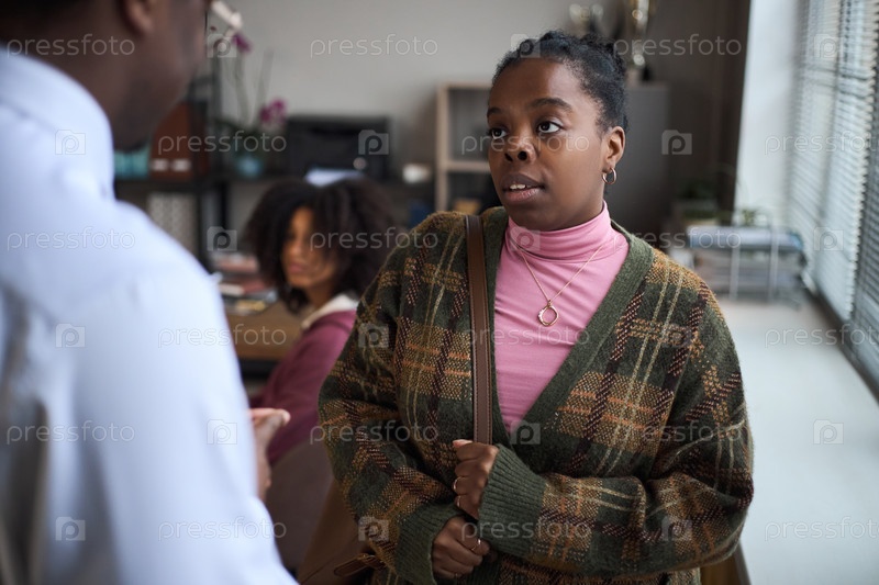 Молодая чернокожая женщина разговаривает с директором школы в офисной обстановке