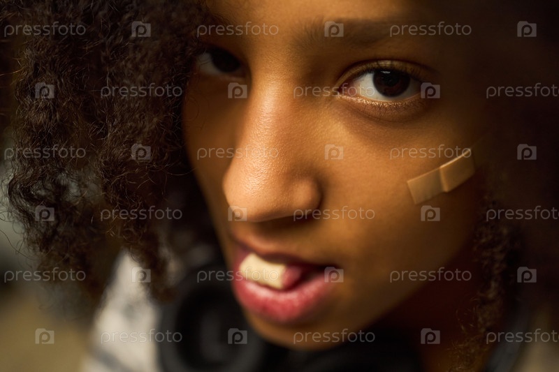 Портрет подростковой чернокожей девушки, глядящей на камеру с повязкой на щеке