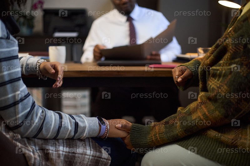 Чернокожий мужчина средних лет встречается с двумя молодыми женщинами в офисе директора школы