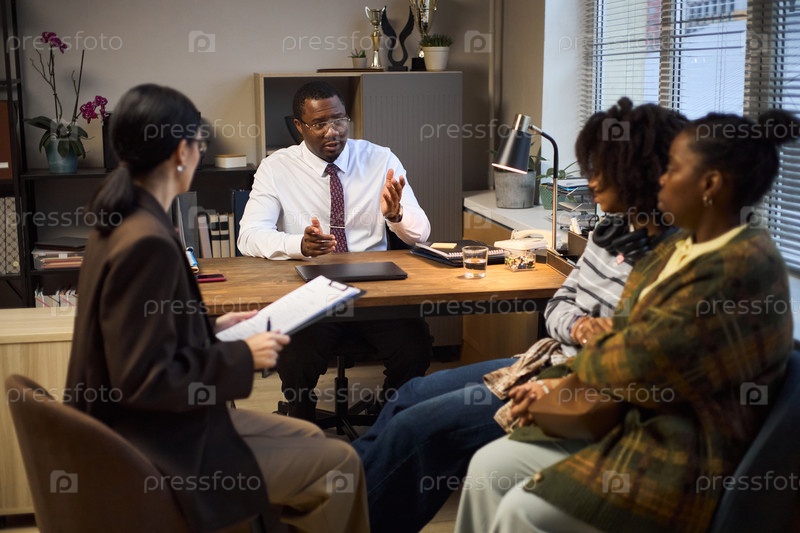 Чернокожий мужчина среднего возраста, исполняющий обязанности директора школы, встречается с обеспокоенными родителями