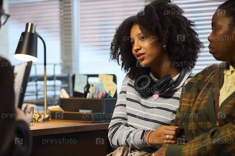 Чернокожая девочка-подросток сидит с родителем и разговаривает с директором школы в офисе