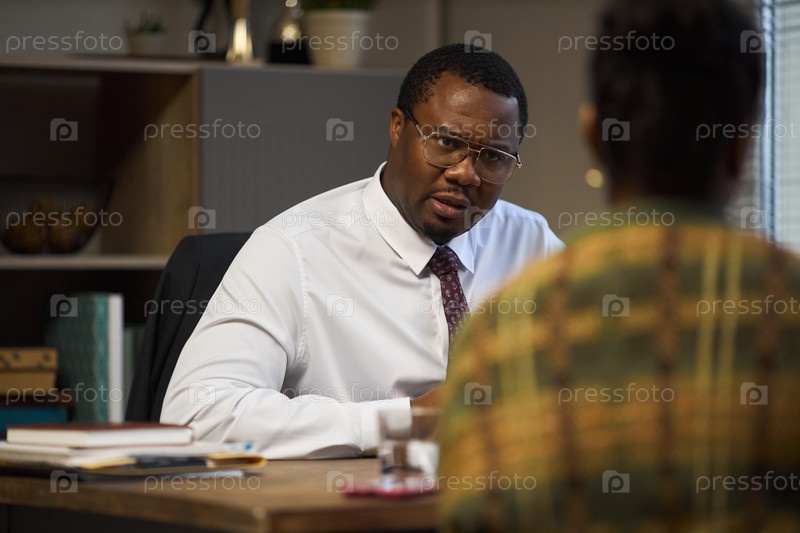 Чернокожий мужчина среднего возраста выступает в роли директора школы, разговаривает с родителем