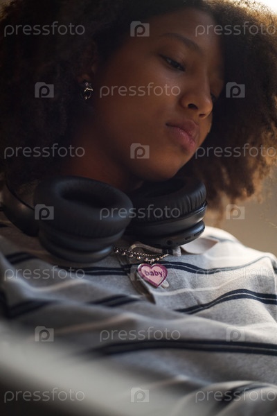 Черная девочка-подросток, которая носит наушники и внимательно сидит в помещении