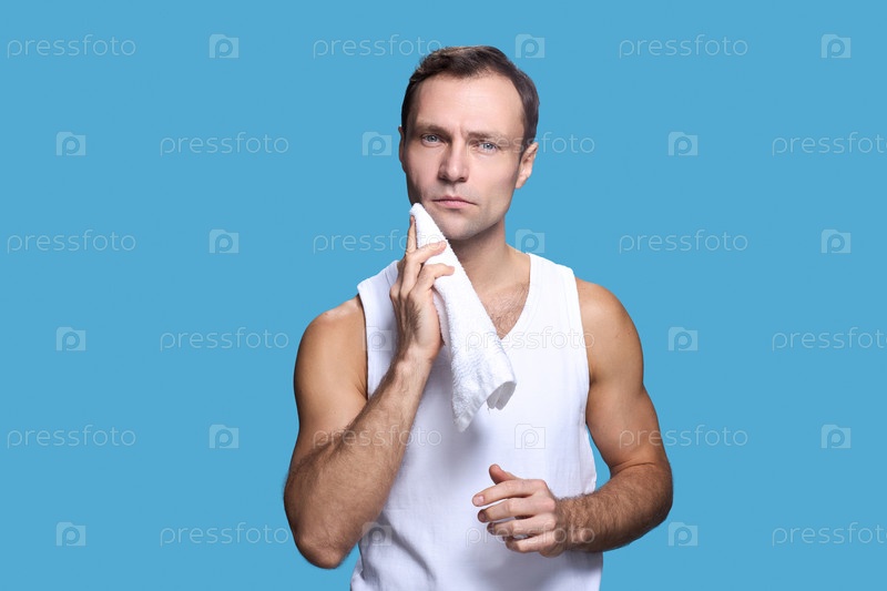 Портрет молодого взрослого мужчины, стирающего лицо полотенцем после тренировки