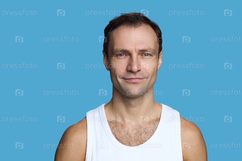 Портрет молодого взрослого мужчины, улыбающегося на синем фоне