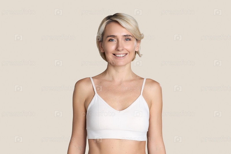 Портрет молодой взрослой женщины, улыбающейся на нейтральном фоне