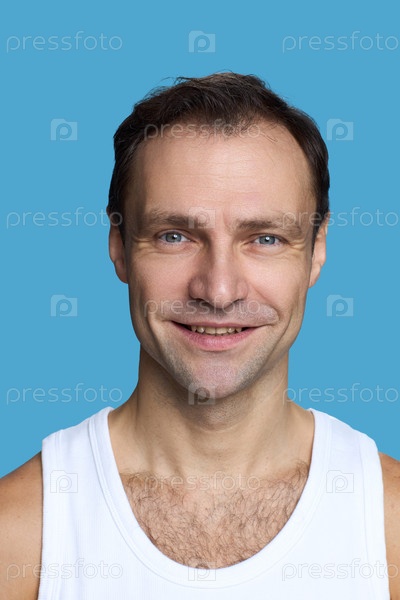Портрет мужчины среднего возраста, улыбающегося на синем фоне