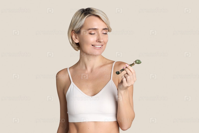 Молодая взрослая женщина улыбается, используя ролик для массажа лица