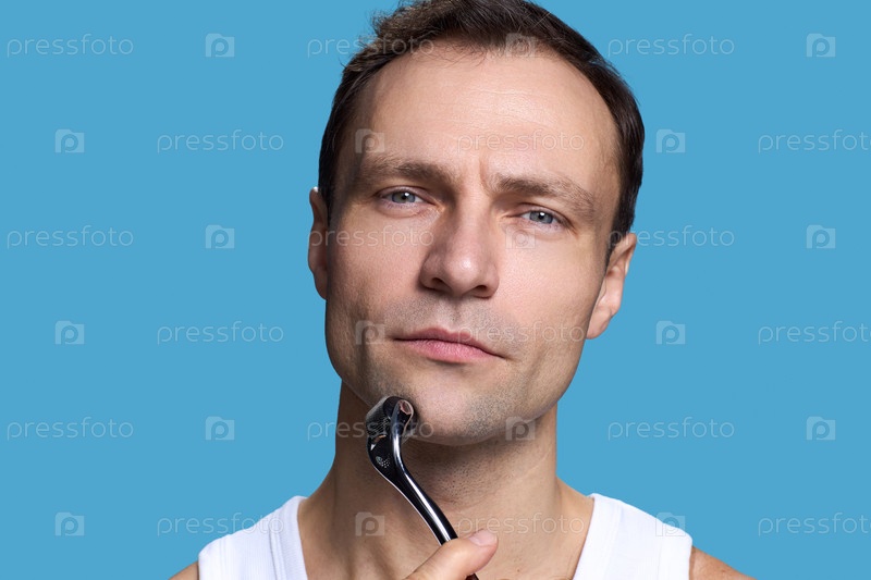 Портрет молодого взрослого мужчины, использующего дермароллер для рутины ухода за кожей
