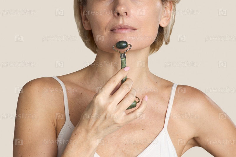 Женщина среднего возраста, масажирующая челюсть с помощью инструмента ролика для лица