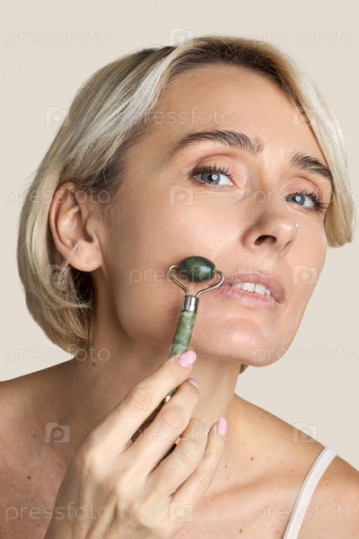 Портрет женщины среднего возраста, использующей лицевой ролик для ухода за кожей