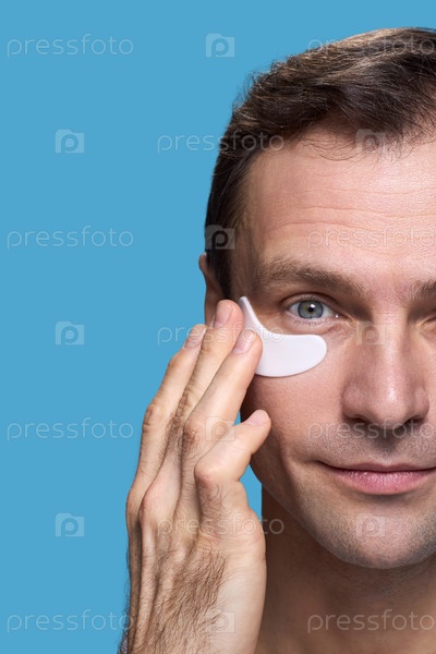 Мужчина среднего возраста наносит глазный пластырь под глазами на синем фоне