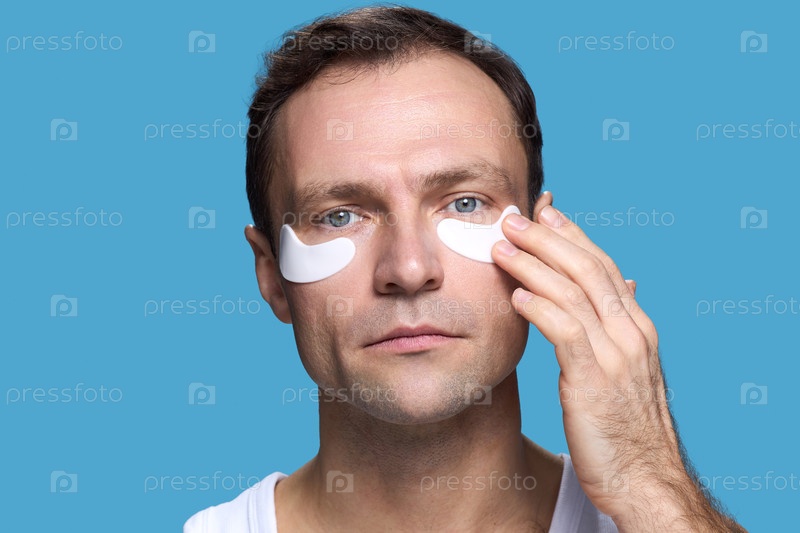 Портрет мужчины среднего возраста, наносящего глазные пластыри на синем фоне
