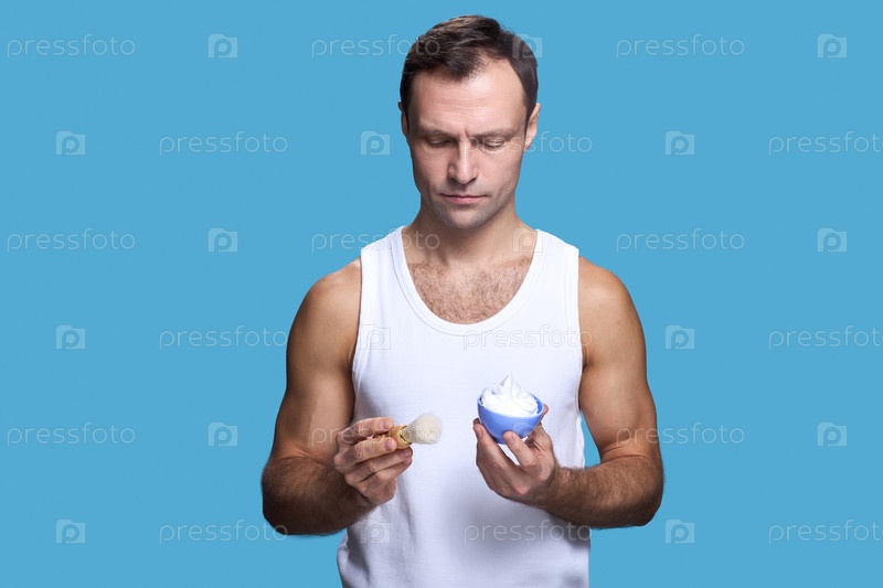 Молодой взрослый мужчина наносит бритвенный крем с щеткой против синего фона