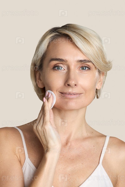 Портрет женщины среднего возраста, наносившей очиститель для лица и улыбающейся