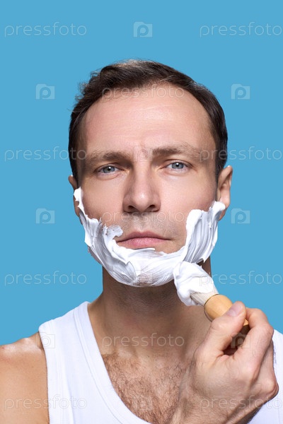Портрет мужчины среднего возраста, наносящего боролочную пену на лицо