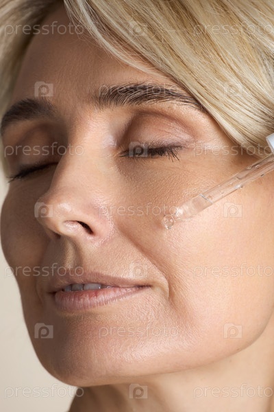 Портрет женщины среднего возраста, применяющей сыворотку для лица и продукт по уходу за кожей