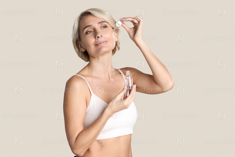 Женщина среднего возраста наносит сыворотку для лица, улыбаясь нежно