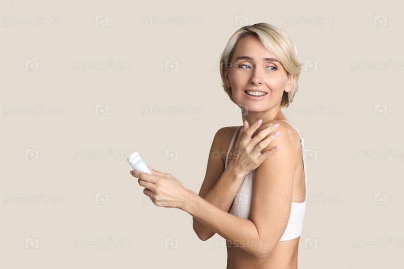 Молодая взрослая женщина применяет продукт по уходу за кожей Улыбаясь в помещении
