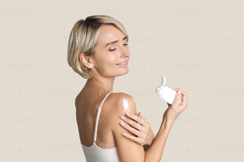 Молодая взрослая женщина наносит лосьон на плечо и улыбается