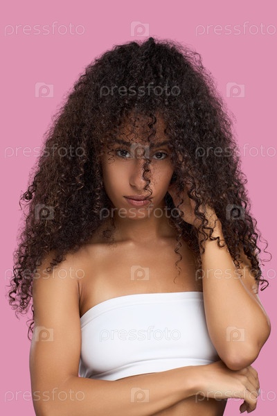 Портрет молодой взрослой чернокожей женщины, касающейся кудрявых волос на розовом фоне