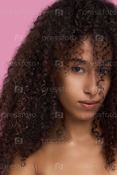 Портрет молодой взрослой чернокожей женщины, с уверенностью глядящей на розовый фон