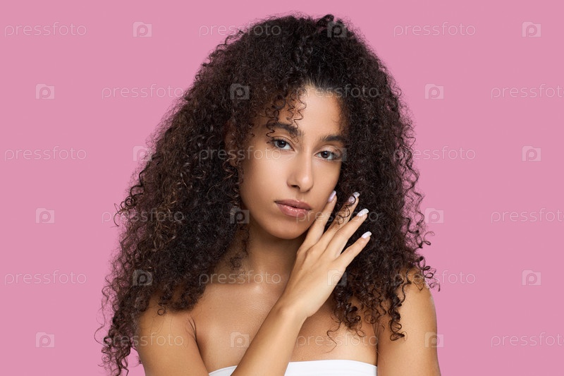 Портрет молодой взрослой испаноязычной женщины, прикасающейся к лицу, глядя в камеру