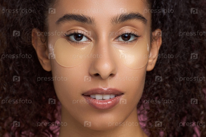 Портрет молодой взрослой чернокожей женщины, применяющей под глазами пластыри для ухода за кожей