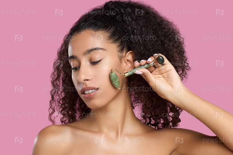 Молодая взрослая черная женщина скользит на нефритовом ролике вдоль челюсти для массажа лица
