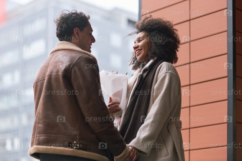 Молодой человек дарит цветы улыбающейся молодой черной женщине на открытом воздухе