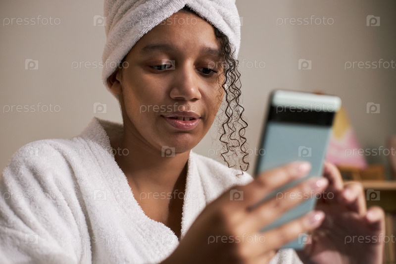 Молодая взрослая чернокожая женщина отправляет текстовые сообщения на смартфон, готовясь к онлайн-знакомствам