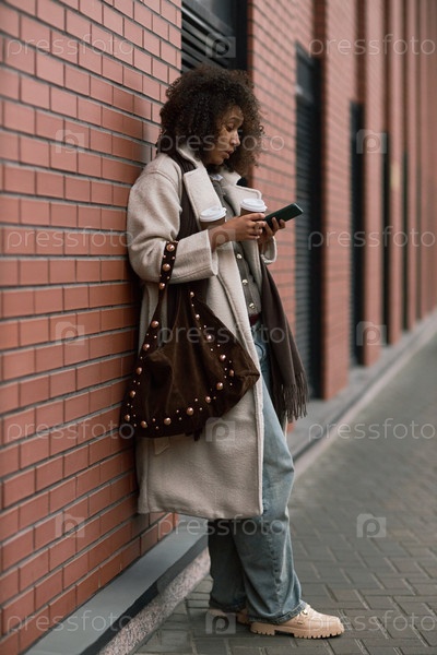 Молодая взрослая чернокожая женщина, стоящая на улице и отправляющая сообщения по смартфону во время свидания