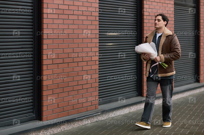 Молодой взрослый мужчина ходит на открытом воздухе, держа букет для встречи со свидетелем