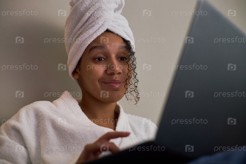 Молодая взрослая чернокожая женщина улыбается во время онлайн-чата для знакомств