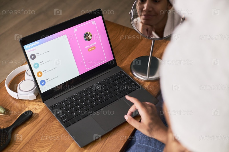 Молодая взрослая чернокожая женщина использует ноутбук для онлайн-знакомств и улыбается при размышлениях