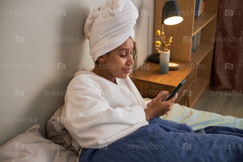 Молодая взрослая чернокожая женщина отдыхает в постели, отправляет сообщения на смартфон для знакомств