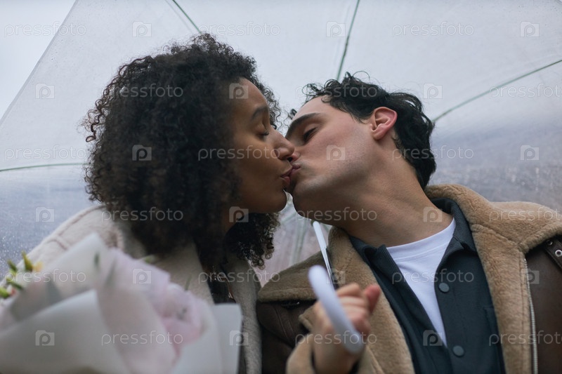 Молодая взрослая мультиэтническая пара целуется под зонтом во время романтического свидания