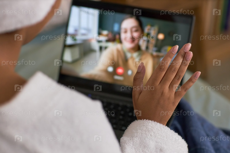 Молодая взрослая женщина машет рукой во время онлайн видео знакомства звонок на ноутбуке