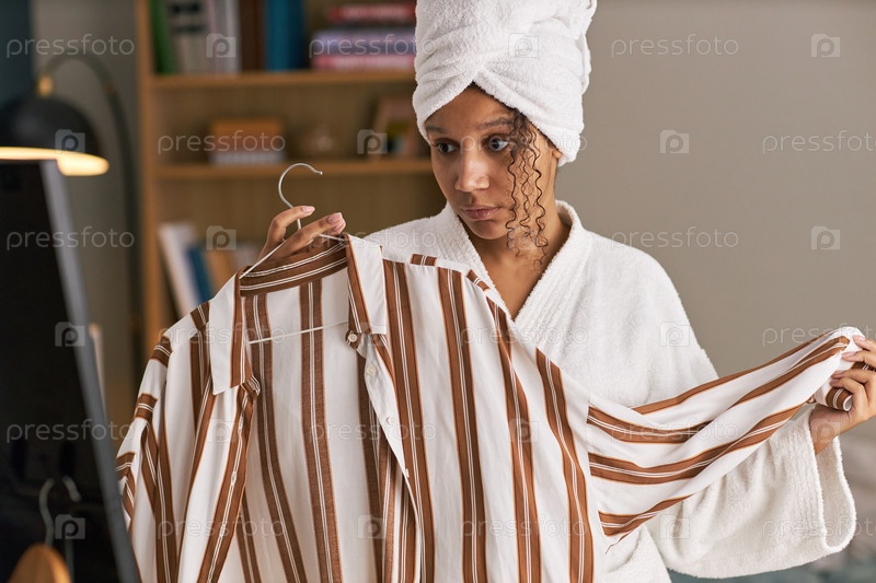 Молодая взрослая чернокожая женщина выбирает наряд, готовясь к свиданию дома